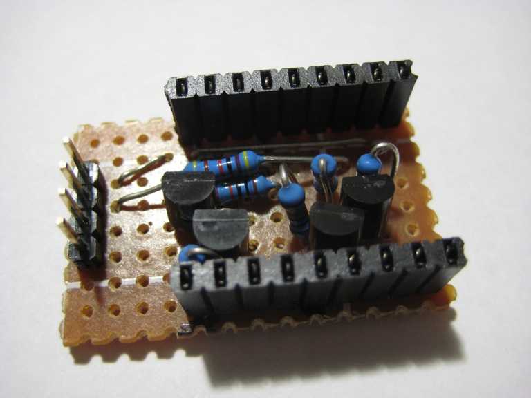 Having proved that the circuit would work, I then moved on to consider how I could build a permanent interface based on the FT232RL. After some consideration it occurred to me that it made sense to simply integrate the buffering circuit with the breakout board. Using protoboard, I built a circuit consisting of the transistor buffering (I used the generic PN100 NPN transistor) and two headers into which the Sparkfun breakout board can be plugged.