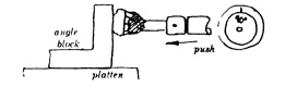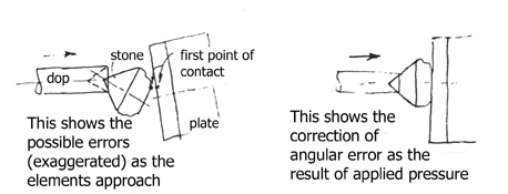 There are apparent advantages to this system. Early removal of the original dop avoids a danger of movement of the stone, which is a problem when the original dop is removed as a last step. It also corrects the effect of any mechanical error in the straightness of the original dop. This particular method was taught at the ULTRA TEC Faceting School by Ed Danbom, who is a noteworthy custom faceter. John Grieger's version of this "remove and realign" method, using no transfer fixture at all, was to place a prepared cavity dop into the faceting head, which was set at 90°. Then he would use an accurate 90° block which was set on the lap or platen as a square surface to push against. This method is a little trickier in that it depends on the forward thrust of the dop, which is accomplished by sliding the faceting head forward to equalize pressure against the rim of the cavity dop and to eliminate lateral angular errors.